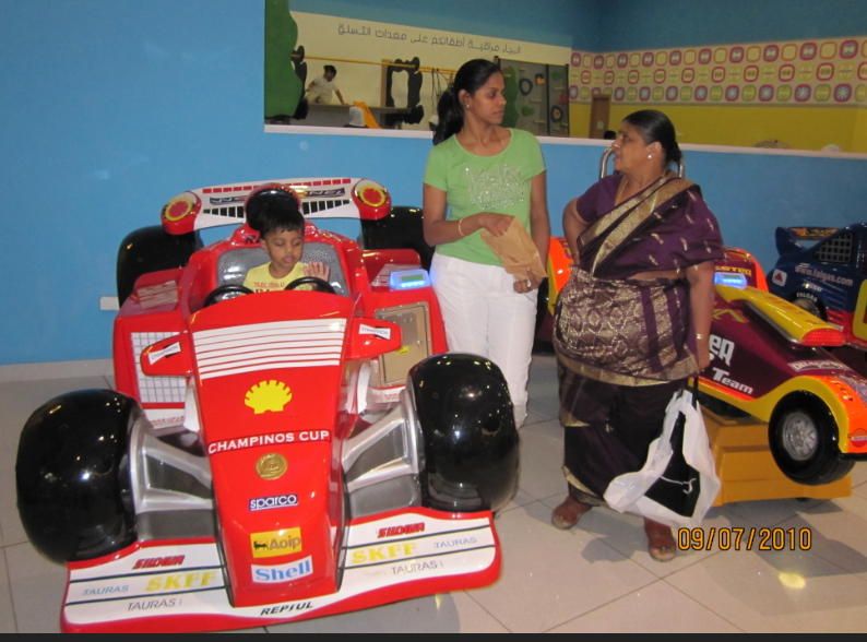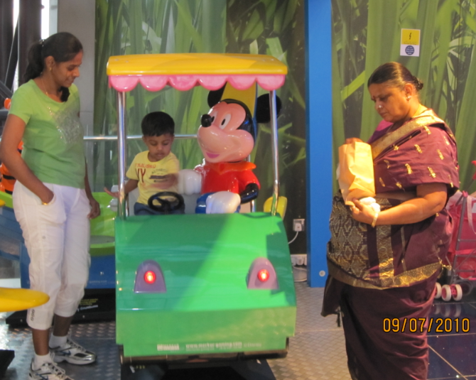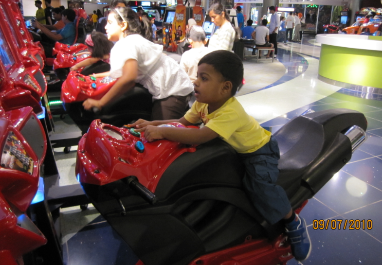 Time to go back home, Vidya and Mami wanted to drink coke and sprite and I got them one. As we were getting out, I made Ani sit on the race bike (simulator) just for fun. There was a girl next to him who was actually playing the game. He watched her and wanted to do like her. Press the buttons, get it started, shake it sideways on turns and move on.