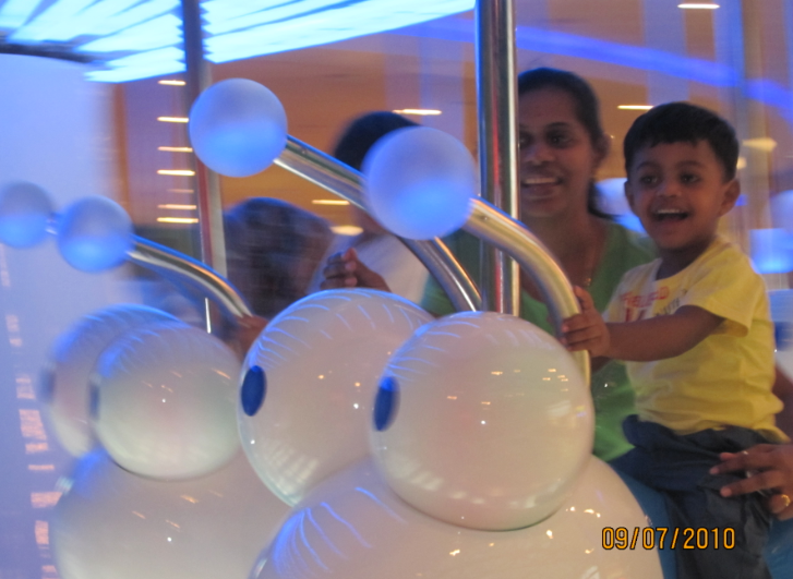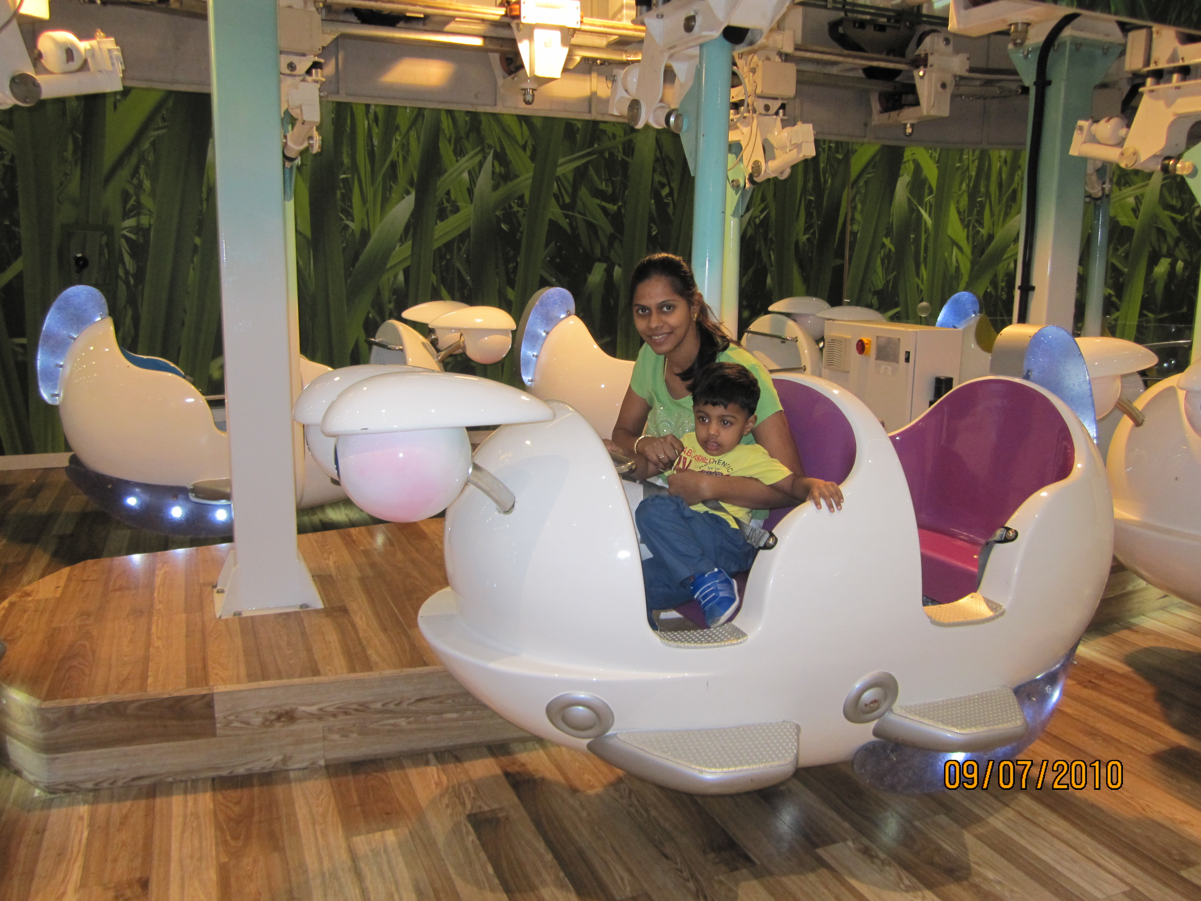 Maybe he is too young for it, that’s how we have to console ourselves. Next we moved on to the merry go round with the bee. Vidya stood beside him. Oh, yeah, he did enjoy this when it went around and around.