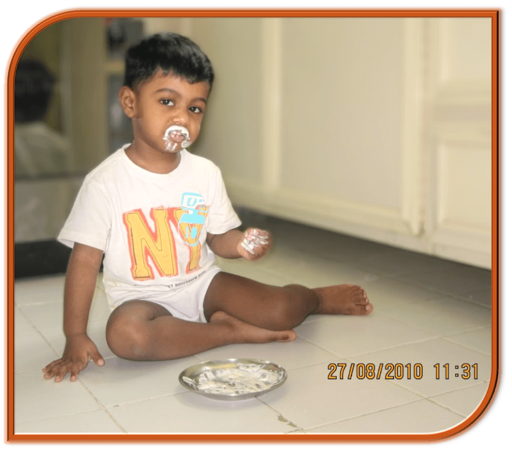 When he was between 2 and 3 years he was quite fond of “KDD” Thick cream which would come in the tetra pack. He would open the seal, squeeze the pack and eat directly from it. Sometimes we used to wonder if this boy had the strangest of eating habits as he likes to taste different things.