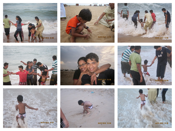 Summer break in Kuwait and fly away to India to catch up with relatives and friends in India. Enjoy local cuisine, street food, delicacies and relax in the sweet loving care of Parents who welcome you with a gush of cheer and happiness. And this year was special as Ravi and Lakshmi had planned for Upanayanam of Abhishek at Chennai. So all relatives had also come down from Mumbai and so it was a grand gala celebratory fest when everyone is around. Beach is a preferred option when it comes to Chennai as it spreads many a kilometers and is sandy, clean and lovely. This is where you really get yourself acclimatized with nature in all it’s care and beauty.